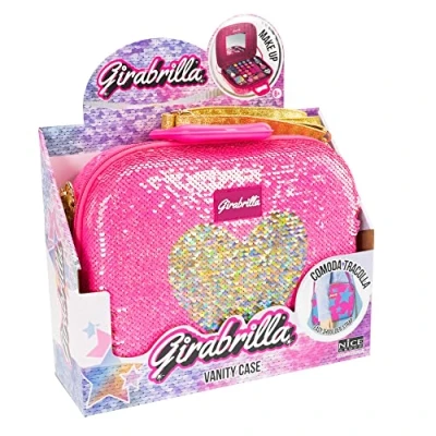 Sparkling Girabrilla Briefcase Make Up Case PINK Heart GOLD Coated with a magical layer of reversible sequins that change color! Inside there is a make-up tray with 12 eye shadows, 8 lipgloss, 3 blushers, 1 cream lip gloss, 2 nail polishes, 1 separate, 1 heart shaped file, makeup applicators, nail stickers. Original Girabrilla product. Paraben Free Recommended age: 6+