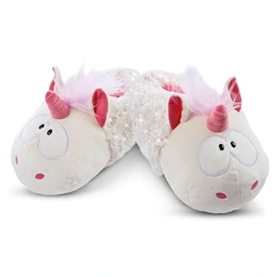 The magical NICI plush slippers with the unicorn Theodor design warm foot and heart at the same time. They are a real eye-catcher. A special highlight are the glitter elements integrated in the plush. Thanks to the extra-soft filling and an integrated elastic band, the cuddly animal slippers fit the foot wonderfully, so that one shoe covers several conventional shoe sizes at the same time. With the NICI plush slippers, the relaxed part of the day can start. Perfect for children and young-at-heart adults. The slippers are part of NICI Green, the sustainable product world from NICI. For all NICI Green products, recycled materials are used almost exclusively, mainly made from PET bottles. Theodor is not only the superstar of the Theodor & Friends collection, but also the sweetest cuddle friend, playmate and soul comforter in one. In his extremely fluffy, cuddly and glittery snow suit and with his new friend Snowman Snowbert by his side, he makes the hearts of unicorn fans even beat faster. Whether as fluffy plush friends in different sizes and designs or as plushy decorative accessories and everyday objects in the wintery unicorn design, the perfect Christmas gift for young and old is guaranteed. Cute gift: for children, adults and cuddly toy fans. The perfect gift for a birthday, for the loved ones, birth, christening, or just because. Nici cuddly toys: for over 30 years, Nici has been providing radiant baby and children's eyes. Nici plush toys ensure cuddly happiness and put a smile on everyone's face., Manufacturer: NICI GmbH