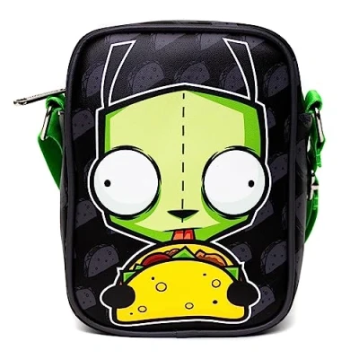 Nickelodeon Bag, Cross Body, Invader Zim GIR Taco Pose With Print Black Gray, Vegan Leather, Black, 8.25" x 6.5"