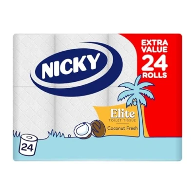 Nicky Elite Coconut Fresh Toilet Tissue 24 Rolls of White Paper, 168 Sheets per Roll, 3 Ply, Exotic Scent, Softeness and Comfort to The Skin, Easy Open Pack, 100% FSC Certified Paper