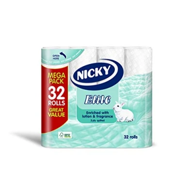 Nicky Elite Toilet Tissue 3 Ply 32 Rolls offers luxury softness, strength, and a gentle talc fragrance in a value-packed, FSC® certified bulk set. Made from pure cellulose and enriched with lotion, it features eco-friendly packaging with 30% recycled plastic for sustainable comfort and convenience.