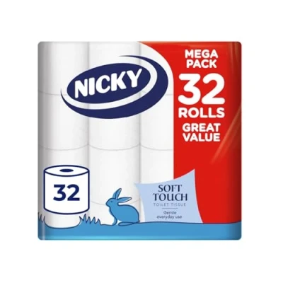 Nicky Soft Touch Toilet Tissue Extra Value Pack 32 Rolls of Gentle White Paper 190 Sheets per Roll 2 ply Modern Embossing Easy Opening 100% FSC Certified