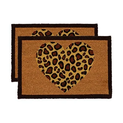 Nicola Spring Coir Door Mat 60 x 40cm Leopard Heart Pack of 2 Decorative Indoor Front Floor Entry Dirt Trapper Rug Outdoor Boot Scraper Non Slip Backing Doormat