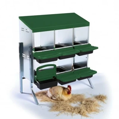 DESIGN FEATURES: 6 individual nesting compartments arranged in two tiers, constructed from durable metal and plastic materials in green and grey colours STACKABLE CONSTRUCTION: Multiple units can be stacked together to expand capacity, perfect for growing flocks and efficient space utilisation COMFORTABLE LAYOUT: Each compartment features a roll-away design with perches, allowing hens to naturally roost while keeping eggs clean and protected PRACTICAL FUNCTIONALITY: Easy-access compartments simplify egg collection and cleaning, with ventilation holes for proper airflow DURABLE MATERIALS: Heavy-duty metal frame combined with sturdy plastic components ensures long-lasting performance in various weather conditions