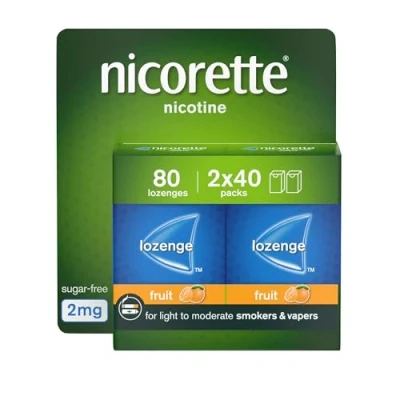 Nicorette Fruit 2mg Lozenge, 80 Lozenges (2 x 40 Packs), Effective and Discreet Quit Smoking Aid for Cigarettes, Nicotine with Dual Layer Fruity Flavour Release