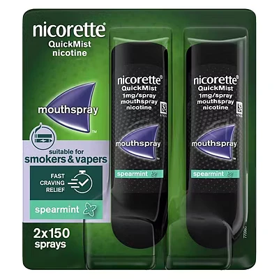 Nicorette QuickMist Mouthspray 1mg, Spearmint Flavour (2 x 150 Sprays) Quit Smoking or Vaping Aid, Designed to Start Reducing Cravings in 30 Seconds (Quit Aid)