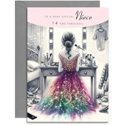 NIECE 14TH BIRTHDAY CARD ⭐ Teenager getting ready for party design specifically for a 14-year-old Niece ⭐ Click the second image for the text inside the card. EXTRA THICK CARDSTOCK ⭐ 330gsm triple coated cardstock with a lovely matt inside surface for ease of writing SIZE ⭐This birthday card measure 148 x 210mm (A5 Size) and comes with a 162 x 229mm grey envelope UK MANUFACTURED ⭐ A small family business. Professionally printed in our Hampshire factory ECO FRIENDLY ⭐ Our factory runs on 100% renewable energy. Our cardstock is sustainably sourced. Both the card and envelope are fully recyclable.