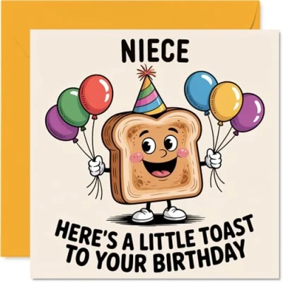 MAKE YOUR NIECE SMILE WITH THIS UNIQUE BIRTHDAY CARD: This exceptional quality Niece birthday card shows the design 'Niece Heres a Little Toast to your Birthday'. If you are looking for an awesome birthday card for Niece, then then this happy birthday Niece card is bound to make them smile. Not just a birthday card for Niece this could also be a birthday gifts for Niece, Step Niece or Niece in Law. WHAT DO YOU GET: The card is printed on one side and BLANK ON THE INSIDE to allow you to write your very own message. The unique fun design is printed on a specially sourced and environmentally responsible board. At 360 microns thick the natural white one-sided gloss board has a quality look and feel. Supplied with a coloured gummed envelope to complement the design and ready to be sealed and sent in the post. Great Niece birthday cards, Step Niece birthday card. NO INK SMUDGES: There is nothing worse than writing inside a card to find that the shiny surface makes the ink smudge. This is why we use a high quality one sided coated board. The uncoated side will absorb more of the ink from your pen to make smudging a thing of the past. Niece birthday cards, Niece birthday cards from Auntie. SIZES: Greeting Card = 145mm x 145mm, Envelope = 155mm x 155mm, Card Thickness = 360 micron. Happy birthday Niece, Nieces birthday card, Niece cards birthday, birthday card Niece, happy birthday Niece card, Niece gifts from Auntie. MADE AND QUALITY CHECKED IN THE UK: We print and manufacture all our products right here in the UK so you can be sure of a fast turnaround and a product that is expertly made. Using environmentally responsible premium board our card is conscious of the responsible management of the world's forests - happy birthday card Niece, Niece birthday cards.
