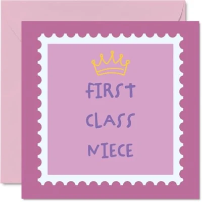 MAKE YOUR NIECE SMILE WITH THIS UNIQUE BIRTHDAY CARD: This exceptional quality Niece birthday card for her shows the design 'First Class Niece'. If you are looking for a beautiful birthday card Niece for her, then then this happy birthday Niece card is bound to make her smile. Not just a birthday card for Niece this could also be a birthday gifts for Niece, Step Niece or Niece in Law. WHAT DO YOU GET: The card is printed on one side and BLANK ON THE INSIDE to allow you to write your very own message. The unique fun design is printed on a specially sourced and environmentally responsible board. At 360 microns thick the natural white one-sided gloss board has a quality look and feel. Supplied with a coloured gummed envelope to complement the design and ready to be sealed and sent in the post. Great Niece Bday cards, birthday cards Niece, Step Niece birthday card. NO INK SMUDGES: There is nothing worse than writing inside a card to find that the shiny surface makes the ink smudge. This is why we use a high quality one sided coated board. The uncoated side will absorb more of the ink from your pen to make smudging a thing of the past. Niece birthday cards, Niece birthday cards from Auntie. SIZES: Greeting Card = 145mm x 145mm, Envelope = 155mm x 155mm, Card Thickness = 360 micron. Happy birthday Niece, Nieces birthday card, Niece cards birthday, birthday card Niece, happy birthday Niece card, Niece gifts from Auntie. MADE AND QUALITY CHECKED IN THE UK: We print and manufacture all our products right here in the UK so you can be sure of a fast turnaround and a product that is expertly made. Using environmentally responsible premium board our card is conscious of the responsible management of the world's forests - happy birthday card Niece, Niece birthday cards.