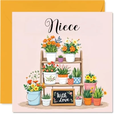 MAKE YOUR NIECE SMILE WITH THIS UNIQUE BIRTHDAY CARD: This exceptional quality Niece birthday card for her shows the design 'Niece With Love'. If you are looking for a beautiful birthday card Niece for her, then then this happy birthday Niece card is bound to make her smile. Not just a birthday card for Niece this could also be a birthday gifts for Niece, Step Niece or Niece in Law. WHAT DO YOU GET: The card is printed on one side and BLANK ON THE INSIDE to allow you to write your very own message. The unique fun design is printed on a specially sourced and environmentally responsible board. At 360 microns thick the natural white one-sided gloss board has a quality look and feel. Supplied with a coloured gummed envelope to complement the design and ready to be sealed and sent in the post. Great Niece birthday cards, Step Niece birthday card. NO INK SMUDGES: There is nothing worse than writing inside a card to find that the shiny surface makes the ink smudge. This is why we use a high quality one sided coated board. The uncoated side will absorb more of the ink from your pen to make smudging a thing of the past. Niece birthday cards, Niece birthday cards from Auntie. SIZES: Greeting Card = 145mm x 145mm, Envelope = 155mm x 155mm, Card Thickness = 360 micron. Happy birthday Niece, Nieces birthday card, Niece cards birthday, birthday card Niece, happy birthday Niece card, Niece gifts from Auntie. MADE AND QUALITY CHECKED IN THE UK: We print and manufacture all our products right here in the UK so you can be sure of a fast turnaround and a product that is expertly made. Using environmentally responsible premium board our card is conscious of the responsible management of the world's forests - happy birthday card Niece, Niece birthday cards.