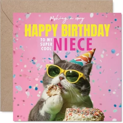 MAKE YOUR NIECE SMILE WITH THIS UNIQUE BIRTHDAY CARD: This exceptional quality Niece birthday card for her shows the design 'Wishing a very Happy Birthday to my super cool Niece'. If you are looking for a beautiful birthday card Niece for her, then then this happy birthday Niece card is bound to make her smile. Not just a birthday card for Niece this could also be a birthday gifts for Niece, Step Niece or Niece in Law. WHAT DO YOU GET: The cards are printed on both sides with the inside print saying 'Have an Amazing Day' and ample space for your own personal message. The unique fun design is printed on a specially sourced and environmentally responsible board. At 360 microns thick the natural white one-sided gloss board has a quality look and feel. Supplied with a coloured gummed envelope to complement the design and ready to be sealed and sent in the post. NO INK SMUDGES: There is nothing worse than writing inside a card to find that the shiny surface makes the ink smudge. This is why we use a high quality one sided coated board. The uncoated side will absorb more of the ink from your pen to make smudging a thing of the past. Niece birthday cards, Niece birthday cards from Auntie. SIZES: Greeting Card = 145mm x 145mm, Envelope = 155mm x 155mm, Card Thickness = 360 micron. Happy birthday Niece, Nieces birthday card, Niece cards birthday, birthday card Niece, happy birthday Niece card, Niece gifts from Auntie. MADE AND QUALITY CHECKED IN THE UK: We print and manufacture all our products right here in the UK so you can be sure of a fast turnaround and a product that is expertly made. Using environmentally responsible premium board our card is conscious of the responsible management of the world's forests - happy birthday card Niece, Niece birthday cards.