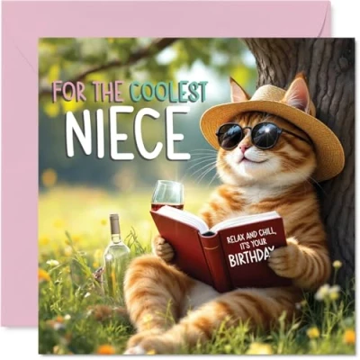 MAKE YOUR NIECE SMILE WITH THIS UNIQUE BIRTHDAY CARD: This exceptional quality Niece birthday card shows the design 'For the coolest Niece Relax and chill its your birthday'. If you are looking for an awesome birthday card for Niece, then then this happy birthday Niece card is bound to make them smile. Not just a birthday card for Niece this could also be a birthday gifts for Niece, Step Niece or Niece in Law. WHAT DO YOU GET: The cards are printed on both sides with the inside print saying 'Have a Great Day' and ample space for your own personal message. The unique fun design is printed on a specially sourced and environmentally responsible board. At 360 microns thick the natural white one-sided gloss board has a quality look and feel. Supplied with a coloured gummed envelope to complement the design and ready to be sealed and sent in the post. NO INK SMUDGES: There is nothing worse than writing inside a card to find that the shiny surface makes the ink smudge. This is why we use a high quality one sided coated board. The uncoated side will absorb more of the ink from your pen to make smudging a thing of the past. Niece birthday cards, Niece birthday cards from Auntie. SIZES: Greeting Card = 145mm x 145mm, Envelope = 155mm x 155mm, Card Thickness = 360 micron. Happy birthday Niece, Nieces birthday card, Niece cards birthday, birthday card Niece, happy birthday Niece card, Niece gifts from Auntie. MADE AND QUALITY CHECKED IN THE UK: We print and manufacture all our products right here in the UK so you can be sure of a fast turnaround and a product that is expertly made. Using environmentally responsible premium board our card is conscious of the responsible management of the world's forests - happy birthday card Niece, Niece birthday cards.