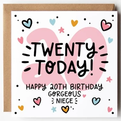 Niece's Birthday 20th Card Cute & Trendy Design Blank Inside With Kraft Envelope Lunella Stationer (Age 20 (Twenty Today)