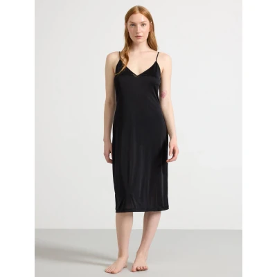 A soft, shiny slip dress in an antistatic fabric with a deep v-neck and slim shoulder straps.