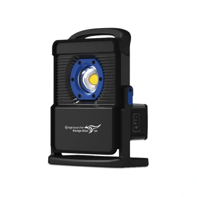 General description The NightSearcher NSKANGASTAR-5K-A Kanga Star Rechargeable 5K LED Worklight is designed for use in harsh working environments, making it ideal for garages, sheds, and construction sites. This versatile worklight can be powered by various tool batteries or an optional NightSearcher 6000mAh battery, ensuring you are never left in the dark. Technical specifications Brightness: 5000 lumens Ingress Protection Rating: IP65 Illumination Settings: 5 Maximum Beam Distance: 50m Maximum Runtime: 15 hours Compatibility and accessories Compatible with 14V and 18V tool batteries from Panasonic, Hikoki (Hitachi), Makita, and Bosch using the appropriate adaptor. Optional NightSearcher 6000mAh battery available. Installation To install, pull out the battery's coloured tab and slot the unit into place.