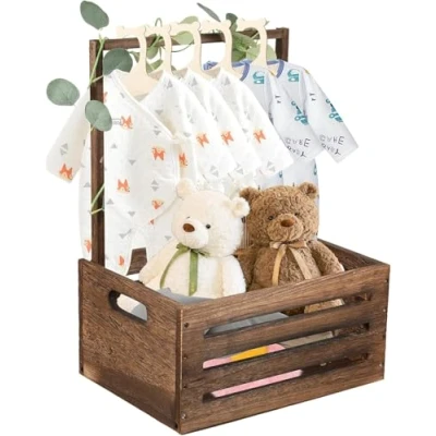 NIHUIFDPY Baby Shower Crate Closet with 5 Hanger +2M Garland, Wood Basket Handle, Decorative Clothes Rack, Hamper Storage for New Parent (Style H)