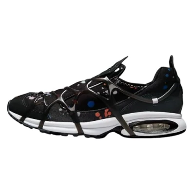 A robust plastic cage around the midfoot area provides support and stability Neoprene-like fabric conforms to your foot and dries quickly Designed for competitive sports, visible air cushioning in the heel ensures lasting comfort The rubber outsole provides traction and durability