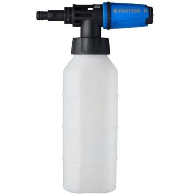 General description This foam sprayer is designed for use with Nilfisk pressure washers. It features a bayonet connection and includes a 1-litre detergent bottle. The sprayer produces a rich foam that adheres to surfaces longer, reducing the need for frequent re-foaming. It allows for easy regulation of foam and detergent doses through an accessible inbuilt filter, which also simplifies cleaning and blockage removal. Technical specifications Capacity: 1 litre detergent bottle Connection type: Bayonet Compatible with: Nilfisk consumer pressure washers Compatibility and accessories Designed for use with Nilfisk consumer pressure washers Primarily used with the Premium Pressure Washer spray lance Installation Connect the sprayer to the gun handle of your Nilfisk pressure washer using the bayonet connection Fill the detergent bottle with the desired cleaning solution Usage Adjust the foam and detergent dosage as needed using the accessible filter Spray the foam evenly onto surfaces for