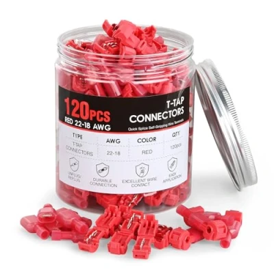 Self-Stripping T-Tap Connectors: Nilight self-stripping electrical t-tap connectors makes tapping into an existing wire a quick and easy job without cutting, splicing and stripping the wires. An easiest way to combine wires. Quality Products: The tinned copper contacts provide maximum conductivity and prevent the wires from shorting out, and it will not bend even when tapping into thicker wires. Firm connection:Thicker tinned copper contacts will not bend even when tapping into thicker wires. T-TAP connector will be firmly mounted on the wire. The housing will not open easily after being snapped on the wire. Wide Applications:Suitable for many wiring projects, such as ship wiring, car wiring, scientific wiring or home wiring projects. Nilight T-fitting kit allows you to quickly connect any 22-16 gauge wire. Packages Includes: 60pcs quick splice wire taps and 60pcs spade terminals, 120pcs in total.
