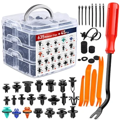 UNIVERSAL FIT KIT: - Our auto push retainer clips set contains 635pcs plastic fastener retainer clips with plastic box car trim removal tools for GM, Toyota, Honda.Can meet your various needs for cars HIGH QUALITY: - Our auto body fasteners retainer car push pins clips are made of premium nylon quality material with heavy duty construction for durability; this push type retainers set would not break or crack easily during use BONUS ACCESSORIES: - We provide different size fastener removers and cable ties to help you quickly and easily remove car door panel and upholstery clips without causing damage to them; easy access into confined areas PREFECT FOR WHAT YOU NEED: - Up to 680 pieces of retainer clips in a plastic box, allows to freely DIY your vehicle accessories at anytime you wanted; it is definitely cheaper than going to the auto parts store WIDE APPLICATION: - Professional push clips are widely used for car panel, door trim, bumper and fender for GM Ford Toyota Honda Chrysler etc