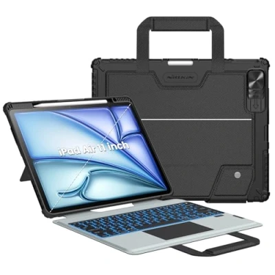 【Compatibility】 Nillkin iPad Keyboard Case with Handle Designed specifically for iPad Air 11 Case (M2, 2024) Air 6th Generation/Air 5th Generation 2022/Air 4th Generation 2020, and iPad Pro 11 inch (2022/2021/2020/2018); models: A2435, A2761, A2759, A2316, A2324, A2325, A2072, A2377, A2459, A2301, A2460, A2068, A2228, A2230, A2231, A1980, A2013, A1934, A1979 【Feel-Good Typing】Our removable keyboard case with the same technology as the acclaimed lg K380, enjoy a typing experience that rivals the best. Tested for over one billion keystrokes, it's built to last up to 6 years. 【Click-anywhere Trackpad】This iPad Keyboard Case with Handle Boasting an 6-core processor akin to cutting-edge smartphones, the touchpad delivers a remarkably smooth experience. With full support for Apple gestures, navigating your device becomes second nature. And our trackpad is 30% larger than (popular brand‘s), providing you with an expansive canvas for control. 【180° Ajustable Stand】 Experience unparalleled flexibility with our removable keyboard case featuring an exclusive 180° adjustable stand. Seamlessly switch between landscape and portrait modes for unparalleled adaptability in any scenario, setting it apart from cases with fixed stands. 【Ergonomic Design】 Nillkin iPad Keyboard Case have 4 brightness levels and vibrant 7-color backlit keyboard provide smooth typing day or night. Seamless experience with built-in pencil holder and automatic wake-up and sleep functions.