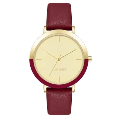 Mineral crystal lens Matte light champagne dial with gold-tone hands and markers; debossed markers at all other hour positions Red faux leather strap with buckle closure Not water resistant