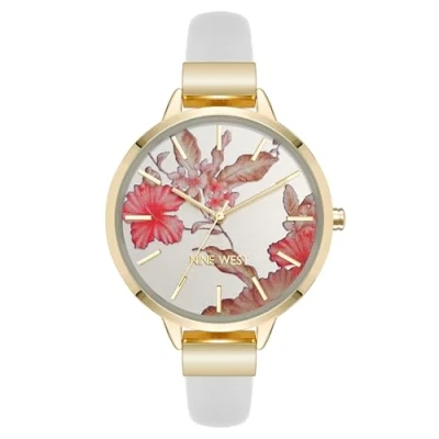 Mineral crystal lens Silver-tone textured dial with 3D printed floral design; gold-tone hands and markers White faux leather strap with a buckle closure Not water resistant