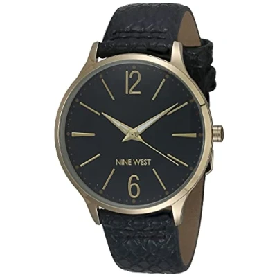 AmazonDomed mineral crystal lens Matte black dial with white filled gold-tone hands and markers; printed outer minute track Black snake patterned strap with buckle closure Not water resistant