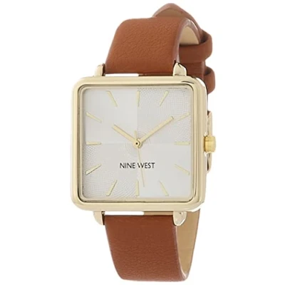 Mineral crystal lens Silver-tone textured dial with gold-tone hands and markers Honey brown faux leather strap with buckle closure Not water resistant