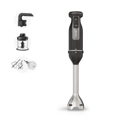 1 BASE POWERS 3 APPLIANCES: Switch between the Hand Blender, Hand Mixer and Chopper attachments for effortless whisking, mixing, blending and chopping. Easy to use with hands-free Eject button TOTAL CONTROL: The 850W base recognises the attachment in use & offers optimised speed settings. You're in control with 2 blending speeds & 5 mixing speeds plus Turbo. HAND BLENDER: Blend and puree with the durable stainless steel immersion blender attachment. Evenly weighted for omplete control with one hand. HAND MIXER: Quickly mix batters with the beaters. Whip cream and whisk eggs with the balloon whisk. Gradual-start. CHOPPER: Fast, controlled chopping in 500ml bowl with storage lid. INCLUDES: Ninja Foodi 3 in1 Blender (UK Plug) with 850W Powerbase, 1.5m Cord, Hand Blender & Hand Mixer Attachments, Balloon Whisk, 2x Beaters, 500ml Chopping Bowl with Stacked Blade & Storage Lid, Recipe Guide. Weight (Blender Mode):1.07kg. Colour: Black DIMENSIONS (Blender mode): H40.4cm x W7.6cm x L6.9cm. 2 year guarantee upon registration with Ninja (UK & ROI only). THE UK's NO.1 BLENDER BRAND*: UK market data, sales by value Jan 24 - Dec 24, Weight: 4.3431065614 Pounds, Manufacturer: Ninja