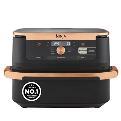 Ninja Foodi FlexDrawer Air Fryer, Tongs, Dual Zone, Removable Divider, Large 10.4L Drawer, 7 in 1, Fry, Roast, Bake, Crisp, Non Stick Dishwasher Safe Parts, Black & Copper, AF500UKCP