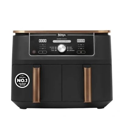 AMAZON EXCLUSIVE: This 6-in-1 Dual Zone Air Fryer features sleek copper accents and includes a pair of Silicone Tongs. 6 cooking functions: Max Crisp, Air Fry, Roast, Bake, Reheat, Dehydrate ENERGY-SAVING: Save up to 65% on your energy bill* (*testing and calculations based on recommended cook time for sausages, using air fry function versus conventional ovens) 2 INDEPENDENT COOKING ZONES: Cook 2 foods, 2 ways, both ready at the same time. Quick, complete meals using no oil. Air Fry: up to 75% less fat* (*Tested against deep fried, hand-cut French fries) EXTRA-LARGE CAPACITY: Cook up to 8 portions. Each drawer fits up to 1.4kg fries or a 2kg chicken. Cook up to 75% faster than fan ovens* (*Tested against fish fingers and sausages, including preheat) INCLUDES: Ninja Dual Drawer Air Fryer (UK Plug), Silicone tongs, 2x non-stick dishwasher-safe 4.75L Drawers (9.5L total capacity) & Crisper Plates. Chef-created Recipe Guide. Weight: 8.8kg. Colour: Copper/Black. DIMENSIONS: H32.5cm x W41.5cm x D27cm. 2-year guarantee upon registration with Ninja (UK & ROI only)., Weight: 19.400679056 pounds, Manufacturer: Ninja