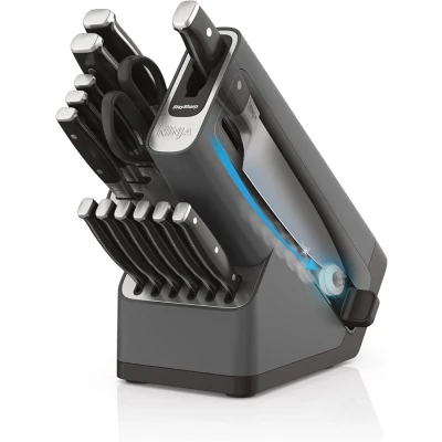 #html-body [data-pb-style=MGY74TM]{justify-content:flex-start;display:flex;flex-direction:column;background-position:left top;background-size:cover;background-repeat:no-repeat;background-attachment:scroll}Introducing a deluxe edition of our Ninja Foodi StaySharp Knife System - now in a 14-piece set featuring 12 essential kitchen knives, a dedicated knife block with handy built-in sharpener and a pair of kitchen scissors, built to last from forged German stainless steel with precision blades. The Ninja Foodi StaySharp Knife System is perfect for experienced chefs and kitchen newcomers alike.Never experience the frustration of a blunt knife again. Maintain incredible sharpness with an integrated StaySharp knife sharpener conveniently built into the storage knife block. This innovative at-home blade maintenance solution delivers continuously sharp performance, time after time. Starts sharp, stays sharp.Simply lock a clean, dry blade into the StaySharp Knife Sharpener to restore superior sharpness* in seconds, with just a few swipes of the lever.Unlike some other sharpeners, which can deliver inconsistent results and can damage knives, the StaySharp dynamic stone sharpening wheel is engineered to engage your blade at the perfect angle and applies the optimum amount of pressure to restore your blade’s incredibly sharp edge.These premium knives stay sharp for 10 years with recommended sharpening. Sharpen every 2 weeks for optimum results, or when you notice a reduction in cutting performance.The sharpener is exclusively designed to sharpen Ninja blades. Durable Stainless SteelBuilt to last from forged German stainless-steel, Ninja knives are rust resistant and strong enough for all your kitchen cutting tasks.Each knife is crafted with a full tang – this means one solid, continuous piece of stainless steel forms the blade and runs all the way through the handle. This durable construction method and double rivet design deliver long-lasting quality. Precise PerformanceChopping and slicing has never been easier. Ninja’s precision blades easily slice through tough ingredients with a 22° cutting angle – expertly engineered for optimum sharpness. Comfortable GripThe ergonomic, chef-approved handles are wear-resistant and designed for maximum comfort, even when used for extended periods of time. A premium half-bolster at the base of the handle enables an easy, professional pinch grip that gives you total control, while still allowing full-length knife sharpening. Which knives are included in this knife block set? 8” Chef KnifeThis multi-purpose Chef Knife features a perfectly balanced design, giving you total control and making the knife feel like an extension of your hand. Perfect for chopping, slicing, mincing and dicing meat, vegetables, nuts, herbs and more. 8” Slicing KnifePerfect for precisely cutting thinner slices, use this knife for larger vegetables such as cauliflowers, larger fruits such as melons and carving hot and cold roasted meats. 5” Boning KnifeDebone fish and meats with ease with this Boning Knife. Its thinner and flexible blade is designed to help you manoeuvre around bones to perfectly fillet chicken, fish and other meats. 8” Bread KnifeEasily slice through crusty loaves, fresh sourdough, brioche bread buns and more with this sharp serrated bread knife – it’s also great for cutting through tomatoes and citrus fruits. (Do not use the sharpener on knives with serrated edges.) 5” Utility KnifeThis versatile knife is best for thinner slicing, trimming and filleting – perfect for preparing fish, butterflying chicken breasts before cooking, trimming vegetables or finely chopping medium-sized fruit without squashing it. 3.5” Paring KnifeThis short blade knife is ideal for intricate tasks such as trimming fat, cutting small vegetables such as green beans and chopping fruit such as grapes and strawberries. 4.5” Steak KnivesSavour every bite of your chops, steaks and roasts with these durable Steak Knives. Their precision blades will glide through the thickest cuts. ScissorsThese versatile stainless steel scissors are perfect for snipping herbs, opening packaging and a wide variety of kitchen tasks. They also come apart for easy deep cleaning. (Do not use the sharpener on scissors.) Cook with ConfidenceThis modern, stylish knife block design with stainless steel accents fits conveniently on your worktop and complements any kitchen décor.Easy to clean, Ninja knives should be hand washed to keep them at their best and maintain optimal sharpness. Introducing an exclusive 14-piece edition of our popular Ninja Foodi StaySharp Knife Block with Integrated Sharpener. 10-Year* guarantee – knives stay sharp for 10 years with recommended sharpening Ergonomic design helps you comfortably slice, chop & dice Crafted from rust-resistant German stainless steel Includes: 8” Chef Knife, 8” Bread Knife, 8” Slicing Knife, 5'' Boning Knife, 5” Utility Knife, 3.5” Paring Knife, Scissors, 6 x 4.5'' Steak Knives & Storage Block with Built-in Sharpener. Dimensions: H: 32.7 cm x W: 17.3 cm x D: 36.1 cm *When used in conjunction with StaySharp Sharpener. Upon registration with Ninja, UK & ROI only.Please note under the Criminal Justice Act 1988 (as amended) we are only allowed to sell knives to persons aged 18 and over.Ninja Foodi StaySharp Knife Block with Integrated Sharpener – Deluxe 14-Piece Set K32014EUUK