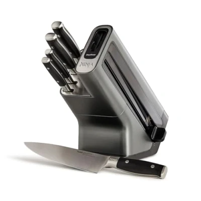 #html-body [data-pb-style=WIYA7Y6]{justify-content:flex-start;display:flex;flex-direction:column;background-position:left top;background-size:cover;background-repeat:no-repeat;background-attachment:scroll} 5-Piece Set – 8” Chef Knife, 8” Bread Knife, 8” Slicing Knife, 8” Utility Knife, 3.5” Paring Knife Knife Block with Integrated Sharpener – Maintain incredible sharpness at home with built-in stone sharpening wheel Durable blades – Built to last with forged German stainless-steel blades Precision slicing – Easily glide through tough ingredients; Ergonomic handles for a comfortable grip Sharp for 10 years – Enjoy continuously sharp performance, time after time .ninjaheader img{ display: block; margin-left: auto; margin-right: auto; height: 75px; width: 150px; } .ninjaheader{ text-align: center; } .ninjaprod img{ display: block; margin-left: auto; margin-right: auto; height: 350px; width: 550px; } .ninjacol { float: left; width: 50%; padding: 10px; text-align: center; } /* Clear floats after the juracols */ .ninjarow:after { content: ""; display: table; clear: both; } .ninja_main { padding-top: 50px; padding-bottom: 50px; } .ninja_info { padding-top: 50px; } .ninja_main{ text-align:center; } .ninjaUL ul{ display: inline-block; text-align: left; } /* Responsive layout - makes the two juracols stack on top of each other instead of next to each other */ @media screen and (max-width: 600px) { .ninjaprod img { width: 350px; height: 200px; } .ninjacol{ width: 100%; } } Ninja Foodi StaySharp Knife Block with Integrated Sharpener – 5-Piece Set [K32005UK] Starts Sharp, Stays Sharp Durable Stainless Steel Precision Blades 5-Piece Set Introducing the Ninja Foodi StaySharp Knife System, perfect for experienced chefs and kitchen newcomers alike. This collection features 5 essential kitchen knives, built to last from forged German stainless steel with precision blades. Never experience the frustration of a blunt knife again. Maintain incredible sharpness with an integrated StaySharp knife sharpener conveniently built into the storage knife block. This innovative at-home blade maintenance solution delivers continuously sharp performance, time after time. Starts sharp, stays sharp. Simply lock a clean, dry blade into the StaySharp Knife Sharpener to restore superior sharpness* in seconds, with just a few swipes of the lever. Unlike some other sharpeners, which can deliver inconsistent results and can damage knives, the StaySharp dynamic stone sharpening wheel is engineered to engage your blade at the perfect angle and applies the optimum amount of pressure to restore your blade’s incredibly sharp edge. These premium knives stay sharp for 10 years with recommended sharpening. Sharpen every 2 weeks for optimum results, or when you notice a reduction in cutting performance. The sharpener is exclusively designed to sharpen Ninja blades. Durable Stainless Steel Built to last from forged German stainless-steel, Ninja knives are rust resistant and strong enough for all your kitchen cutting tasks. Each knife is crafted with a full tang – this means one solid, continuous piece of stainless steel forms the blade and runs all the way through the handle. This durable construction method and double rivet design deliver long-lasting quality. Precise Performance Chopping and slicing has never been easier. Ninja’s precision blades easily slice through tough ingredients with a 22° cutting angle – expertly engineered for optimum sharpness. Comfortable Grip The ergonomic, chef-approved handles are wear-resistant and designed for maximum comfort, even when used for extended periods of time. A premium half-bolster at the base of the handle enables an easy, professional pinch grip that gives you total control, while still allowing full-length knife sharpening. Which knives are included in this knife block set? 8” Chef Knife This multi-purpose Chef Knife features a perfectly balanced design, giving you total control and making the knife feel like an extension of your hand. Perfect for chopping, slicing, mincing and dicing meat, vegetables, nuts, herbs and more. 8” Slicing Knife Perfect for precisely cutting thinner slices, use this knife for larger vegetables such as cauliflowers, larger fruits such as melons and carving hot and cold roasted meats. 8” Bread Knife Easily slice through crusty loaves, fresh sourdough, brioche bread buns and more with this sharp serrated bread knife – it’s also great for cutting through tomatoes and citrus fruits. (Do not use the sharpener on knives with serrated edges. 5” Utility Knife This versatile knife is best for thinner slicing, trimming and filleting – perfect for preparing fish, butterflying chicken breasts before cooking, trimming vegetables or finely chopping medium-sized fruit without squashing it. 3.5” Paring Knife This short blade knife is ideal for intricate tasks such as trimming fat, cutting small vegetables such as green beans and chopping fruit such as grapes and strawberries. Cook with Confidence This modern, stylish knife block design with stainless steel accents fits conveniently on your worktop and complements any kitchen décor. Easy to clean, Ninja knives should be hand washed to keep them at their best and maintain optimal sharpness. *Comparison against typical knife block v-groove sharpener.