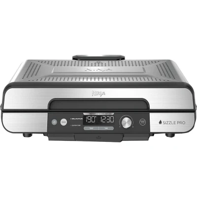 CurrysEnjoy authentic chargrilled flavours all year round with the Ninja Sizzle Pro XL grill and flat plate. It has a 40% larger cooking surface than the previous Sizzle model. That means you can grill up to 10 burgers, chicken or salmon fillets at once. ProTemp iQ gives you precise temperature control from 120 to 260°C. It's perfect for searing steaks, grilling vegetables and getting those lovely chargrilled cross-hatches on your steaks. And the ventilated lid minimises smoke and splatters and locks in flavours. It can even be removed so it's ideal for melting cheese or teppanyaki.Good to know- Its interchangeable ceramic coated plates let you cook with little to no oil, so it's healthier- The grease catch tray collects excess grease so it won't make a mess on your countertop- It comes with a quick start guide and tasty recipes to get the creative juices flowing- The cooking plates are non-stick and the lid is dishwasher safe for hassle-free cleaning