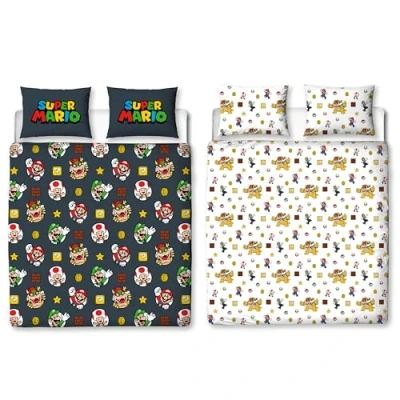 OFFICIAL PRODUCT: Officially licensed Nintendo bedding set, includes a double duvet cover and 2 x pillowcases, and features iconic Super Mario characters REVERSIBLE: Freshen up the look of your child’s bedroom with 2 designs in one. On the front side there’s a repeating pattern of Mario, Luigi, Bowser and Toad on a black background. The reverse side features Mario characters with red shells and 1ups on a white background, with two matching reversible pillowcases EASY CARE: The duvet cover is closed with poppers, so it’s easy to open and remove ready for the wash! The bedding set is washing machine and tumble dryer safe at a low temperature SOFT & COMFY: Made from brushed microfibre, this double bedding set is soft to the touch, and comfortable throughout the night MEASUREMENTS: Standard UK double bedding size, the duvet cover measures 200 x 200cm, and the 2 x pillowcases measures 74 x 48cm each