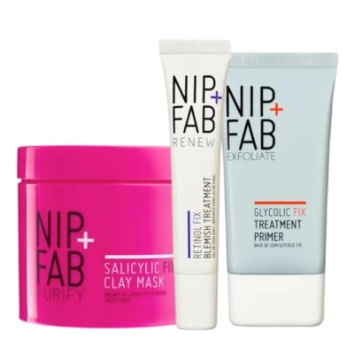 Nip+Fab Skin Perfection Bundle: Retinol Fix Blemish Gel, Glycolic Treatment Primer & Salicylic Clay Mask Trio for Flawless