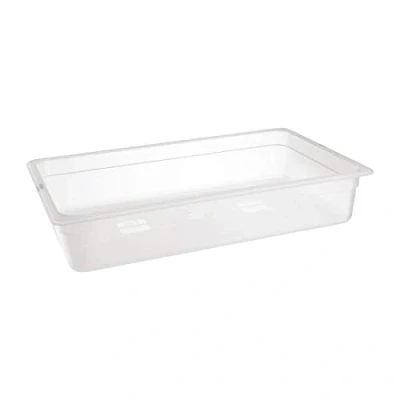 Euroffice100(H) x 530(W) x 100(D)mm. Polypropylene. Clear. Clear design allows you to identify contents instantly without uncovering it. Outer lip to insert container into any 1/1GN-compatible storage racks.