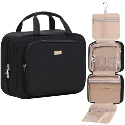 Spacious Capacity: 12 x 4.5 x 9 inches (rolled), 12.5 x 35.5 inches (unfolded). Space saving hanging toiletry bag can hold all your travel essentials: shampoo, conditioner and full-size skincare products Unique interior design: 2 main compartments with mesh pockets and elastic bands to hold bottles upright. Elastic straps of different sizes suitable for size bottles, easy to grab exactly what you need MULTIFUNCTIONAL COMPARTMENTS - Fully open with a transparent design that gives you a complete taste of your things. Four different compartments keep your toiletries in place, and a front zipper pocket provides additional storage with convenience Sturdy Hook Design - Special U-shaped zipper design, quickly take out toiletries or close the toiletry bag. No more unpacking, digging through a bag and laying your stuff on the bathroom counter. Just hang the bag, grab what you need and put it back in Soft and lightweight material: the outer material of the toiletry bag is soft to the touch and lightweight. You can pack this reasonably flat if you don't pack too many things, making it more suitable for travel. Definitely an ideal Christmas gift for yourself, your family and friends