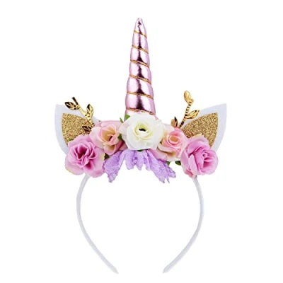 Nishine Unicorn Horn Floral Headband Glitter Ears Pony Head Bands Tiara for Girls Party Birthday Cosplay (Pink&Ivory)