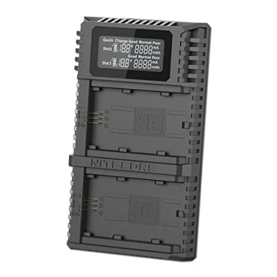 DUAL SLOT SONY NP-FZ100 CHARGER - Dual slot battery charger compatible with Sony NP-FZ100 batteries used in Sony a7 III, a7R III, and a9 (ILCE-9) cameras. QUICKCHARGE 2.0 USB ENABLED - Charge your batteries fast with USB QuickCharge 2.0. Enjoy charging speeds up to 1.2A in a single slot and charge 2 batteries in as little as 2 hours when you use a QC device or adapter! BRIGHT LCD DISPLAY - An easy to read display reports real time information about battery level, voltage, charging current, battery health and more. COMPACT DESIGN FOR TRAVEL - The lightweight and compact body of the USN4 Pro charger makes it ideal for travel while a removable USB cable fits snuggly in an anti-drag groove on the bottom for a better charging experience. PACKAGE CONTENTS - NITECORE USN4 PRO charger, instruction manual, and warranty card.