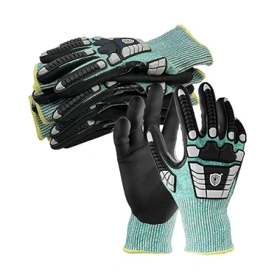 SUSTAINABLE GLOVES: 5 Pairs of impact protection work safety gloves, size 6, designed to help sustain our planet, certified to OEKO-TEX STANDARD 100, The 13 gauge sustainable seamless liner is made from 14 Percent recycled polyester yarn, committed to Net Zero and reducing our carbon footprint IMPACT PROTECTION: Unigloves' Nitrex 295RP are the ultimate high risk safety gloves, designed to withstand even the toughest of working conditions, The TPE protection across the back of the hand acts like a barrier, passing the EN388 impact test and providing all important mechanical protection CUT PROTECTION: these green and black grip gloves feature a medium weight liner and NitreGuard technology for maximum cut protection (cut level F) and enhanced durability against rough, sharp, and abrasive materials MULTI-PURPOSE GLOVES: for everything from waste handling, barrel handling, warehouse, construction, engineering, recycling sorting, roofing and general maintenance, The Nitrex 295RP gloves are touch screen compatible without having to remove the gloves and put hands at risk of injury UNIGLOVES TECHNOLOGY: with their sandy nitrile palm coating and NitreGrip Technology these gloves also provide a reliable grip in dry, wet, or oily environments, making them the perfect solution for both grip and performance