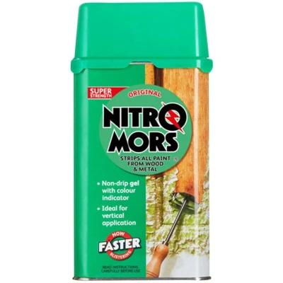 General description Nitromors All-Purpose Paint & Varnish Remover is a powerful gel designed to effectively remove paint, varnish, and lacquer from various surfaces including wood, metal, and masonry. Its non-drip, green-colored formula makes it ideal for vertical applications, ensuring precise application and minimal mess. Suitable for both professional and DIY use, it quickly strips multiple layers of coatings. Technical specifications Volume: 750ml Type: Paint and varnish remover gel Color: Green Application: Suitable for wood, metal, and masonry surfaces Formulation: Non-drip gel, fast-acting, dichloromethane-free Compatibility and accessories Compatible with various paints, varnishes, and lacquers No additional accessories required for application Installation Apply the gel evenly over the surface using a brush or spatula Allow the product to work for the recommended time (usually 15-30 minutes) Use a scraper or wire brush to remove softened coatings Clean the surface with water