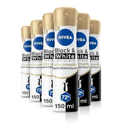 WHITE MARK AND STAIN PROTECTION: The NIVEA Black & White Silky Smooth Anti-Perspirant prevents white marks on black clothing and yellow stains on white clothing with its anti-stain technology 72H SWEAT BLOCK: Experience reliable 72-hour protection against sweat and odours. This NIVEA deodorant for women does not irritate skin after shaving due to its skin conditioner formula 5x ANTI: This women's anti-perspirant is designed to care for both your clothes and skin, providing protection against sweat, odour, stains, residues, and irritation HOW TO APPLY: Shake well before use. Hold the anti-perspirant spray 15cm from underarms and spray evenly. Allow to dry before getting dressed. Do not apply to irritated or damaged skin DERMATOLOGICALLY PROVEN: The anti-perspirant formula is dermatologically tested for skin tolerance and does not contain ethyl alcohol