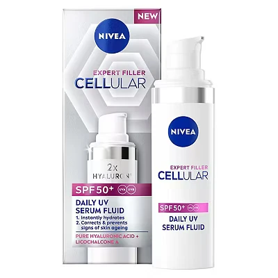 NIVEA Cellular Expert Filler Daily UV Serum Fluid SPF 50+ (30ml), Hydrating Anti Ageing Cream with Sun Protection and Hyaluronic Acid, Face to Smooth Fine Lines Wrinkles