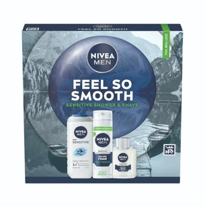 NIVEA MEN Feel So Smooth Skincare Gift Set (3 Products) Men'sGift for Sensitive Skin Includes Shower Gel, Shaving Foam, and Post Shave Balm