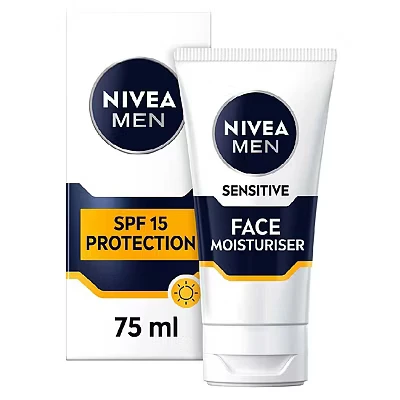 NIVEA MEN Sensitive Face Moisturiser SPF15 (75ml), 0% Alcohol Relieves 5 Signs of Skin Irritation and Protects Against UVA/UVB Rays, Non Greasy Formula