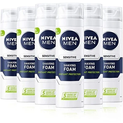 NIVEA MEN Sensitive Shaving Foam Pack of 6 (6 x 200ml) Skin Foam, Shave Gel for Men, Irritated & Dry with Witch Hazel