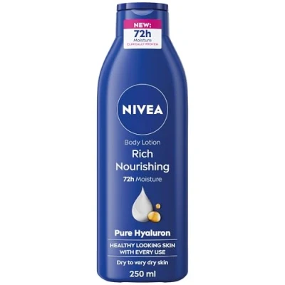 INTENSE HYDRATION: Transform your skin with the NIVEA Rich Nourishing body lotion for dry skin providing clinically proven 72-hour moisture for healthy-looking skin with every use INTENSIVE CARE: Our nourishing formula, enriched with Pure Hyaluron, Almond Oil, and Deep Nourish Serum, delivers intensive care. A body moisturiser suitable for dry to very dry skin that is non-greasy and quick-absorbing EXTRA NOURISHMENT: Some areas of skin dry out quicker than others, so it’s important to give them extra nourishment all year round with NIVEA Rich Nourishing moisturising lotion HOW TO APPLY: Apply the NIVEA lotion daily to the whole body and massage into the skin. Allow lotion to dry and reapply on particularly dry areas if necessary CARE BEYOND SKIN: This moisturising NIVEA lotion cares for your skin and the planet with our new improved bottle that uses reduced plastic compared to before, and a bottle made from 50% recycled plastic (excluding pump)