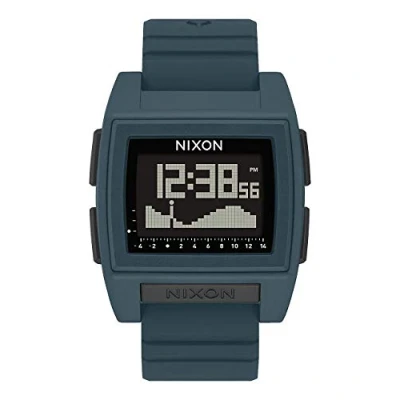 Blue silicone strap with silver pin buckle The case is made of polycarbonate in blue Black dial, digital, tide graphics, date function, chronograph timer, alarm, backlight, Nixon logo The watch has a water resistance of 10 bar (the watch is suitable for frequent swimming or snorkelling) The watch is available in different colours